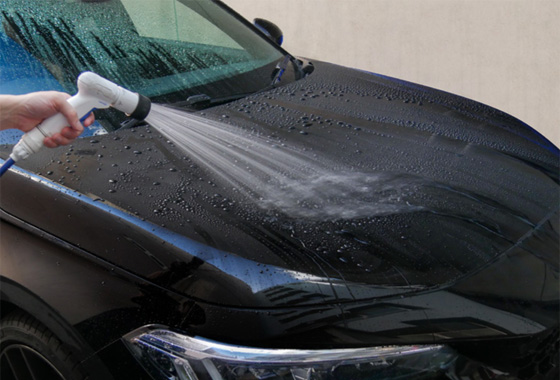 - ボディにしっかり水をかけ、ホコリなど大きな汚れはシャワーで取り除きます。十分に水をかけながら、洗車スポンジを用いて軽くボディをなでて汚れを落としてください。
